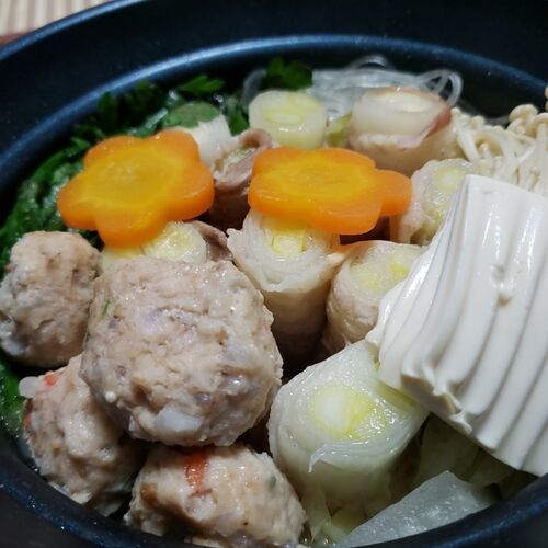 令和2年12月14日 白ネギの豚バラ巻き鍋 (白ネギ・豚バラ・白菜・人参・エノキ・肉団子・春菊・マロニー・豆腐)