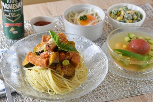 今日の献立 令和4年7月15日 ラタトゥイユの冷製パスタ (茄子・ミニトマト・ピーマン・ズッキーニ・枝豆・かぼちゃ・ベーコン) えびとトマトの冷製コンソメスープ (トマト・きゅうり・トマト・オクラ・コーン缶) オクラとコーンのおかかマヨネーズ (…