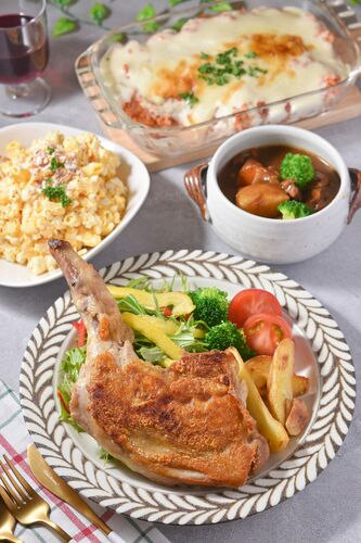 令和6年12月24日の晩ごはん 【お品書き】 骨付き鶏のローストチキン ビーフシチュー トマトピラフのドリア たまごサラダ ケーキ